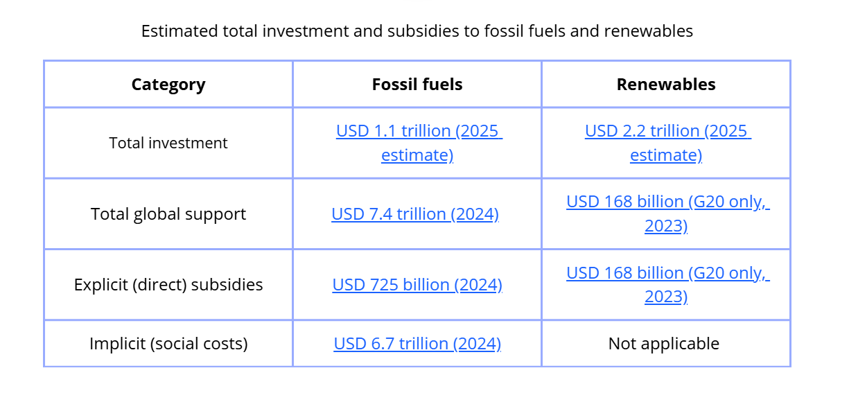 Add to this the subsidies that governments give to oil and gas when there isn’t a crisis, which in 2025 were estimated to range from roughly USD 1 trillion in direct subsidies to an astounding USD 7 trillion including indirect subsidies (primarily under-pricing of environmental costs).
